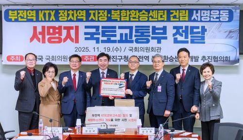 [브레이크뉴스=배종태 기자] 부전역을 KTX 정차역으로 지정하고 복합환승센터 건립을 조속히 추진해 달라는 부산 시민들의 목소리가 국토교통부에 전달됐다. 부산진구는 서울 여의도에서 주민 40만 명의 서명을 정부에 직접 전달하며 부산 도심 교통 혁신의 필요성을 강조했다.