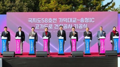 The city of Busan held a groundbreaking ceremony Monday morning at Heemang Park in Gangseo District for the construction of an elevated road connecting Gadeok Bridge and Songjeong Interchange (IC) along National Route 58.
